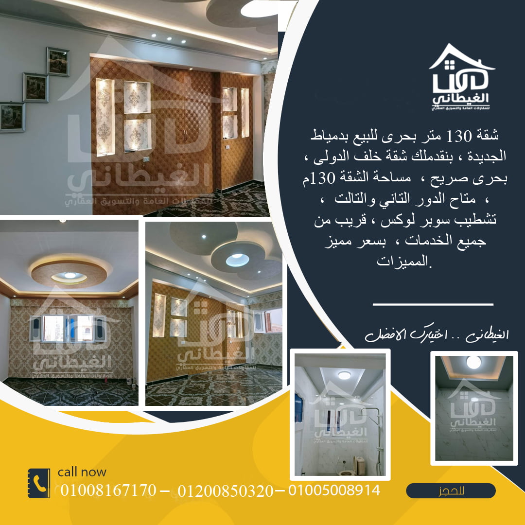 شقة 130 متر بحرى للبيع بدمياط الجديدة ، بنقدملك شقة خلف الدولى ، بحرى صريح ،  مساحة الشقة ١٣٠م  ،  متاح الدور التاني والثالث  ،  تشطيب سوبر لوكس ، قريب من جميع الخدمات ،  بسعر مميز .