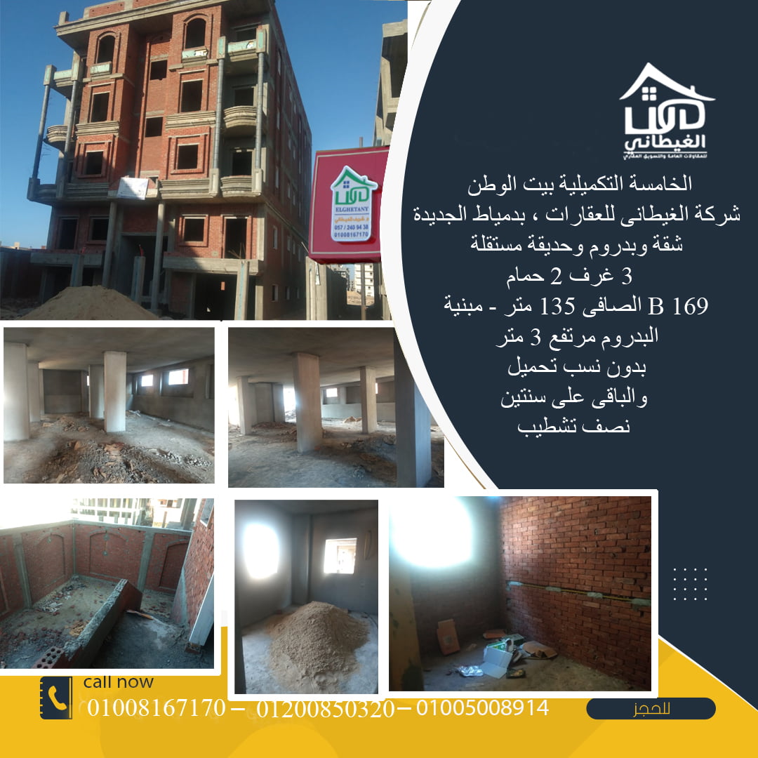 شقق بالتقسيط فى بيت الوطن دمياط الجديدة على سنتين ، المساحة الكلية 169 متر وصافى المساحة 135 متر ، العمارة مبنية ، الشقة والبدروم مرتفع 3 أمتار وحديقة خاصة بسعر واحد 1250000 جنيه يعنى هتشترى 3 فى 1 شقة وبدووم ممكن يتفتح على الشقة وكمان حديقة بمدخل خاص ليك …… يعنى بيت مستقل .