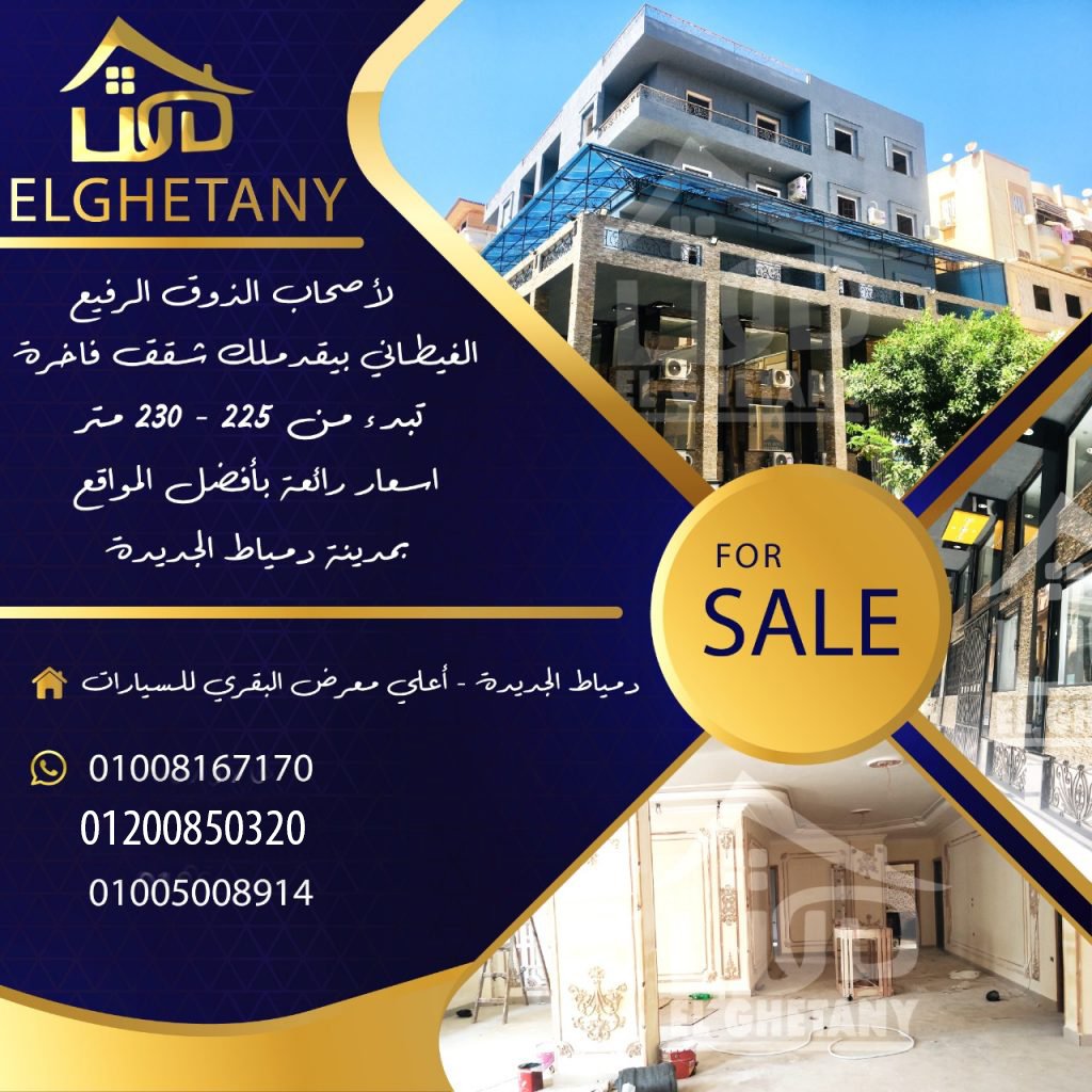 شقة للبيع في دمياط ،مميزة، مدينة دمياط الجديدة من شركة الغيطانى للعقارات ، بدمياط الجديدة ، مساحتها 288 متر ، والمساحة الفعلية 190 متر ، الدور الرابع ، بالحى الثالث المجاورة ( 16 ) .